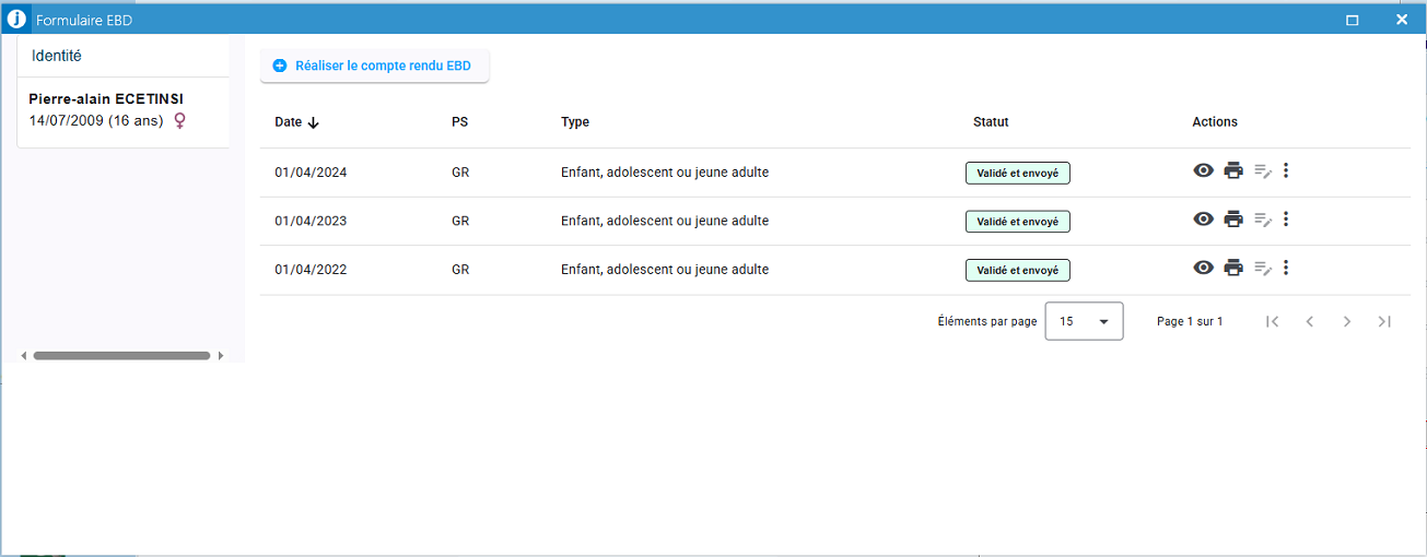 A l'ouverture, vous pourrez visualiser les comptes rendus du patient et ainsi, savoir si l'examen bucco-dentaire a déjà été réalisé cette année (par votre cabinet ou un autre cabinet). Ci-dessous, par exemple, vous pouvez constater qu'un EBD a été réalisé en 2022, 2023 et 2024 pour ce patient.