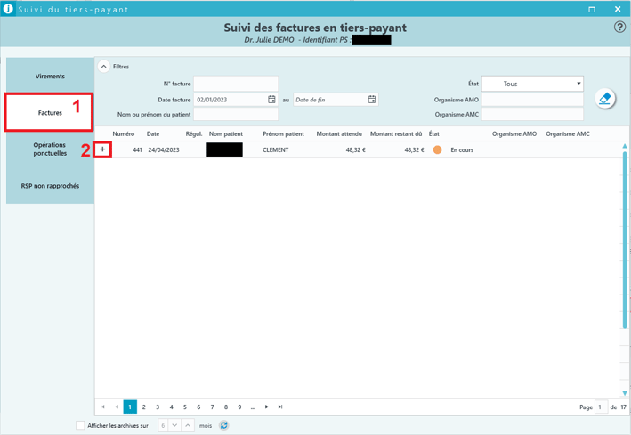 | 1. Cliquez sur FACTURES 2. Ouvrez le détail de la ligne désirée |