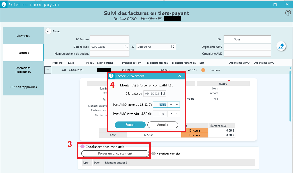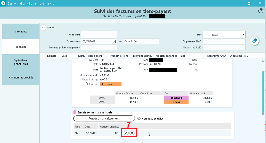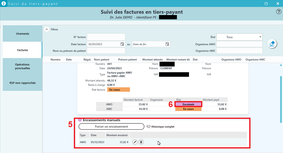 | 5. L'historique des encaissements se met à jour 6. L'état de la part AMO se met à jour |