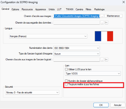Attention : Le comportement de cette passerelle est guidée par l'option présente dans Sopro Imaging ci-contre Cocher la case ''Toujours mettre à jour les fiches" met à jour les informations contenues dans le fichier patient de Sopro Imaging (nom, prénom). Cochez cette case si le numéro de dossier est toujours identique entre un patient Julie et un patient Sopro Imaging. Décocher la case ''toujours mettre à jour les fiches" ouvrira le patient correspondant à l'ID de Julie sans mettre à jour le dossier. Décochez cette case si les numéros de dossier Julie sont différents des numéros de dossier Sopro Imaging afin d'éviter d'écraser des données. |