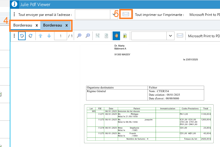 | 4- Les bordereaux sont générés en PDF 5- Cliquez sur le symbole permettant d'envoyer toutes les pièces jointes par email |