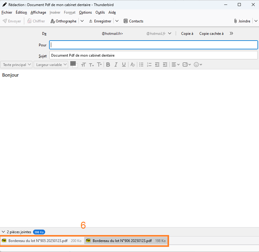 | 6- Le logiciel d'envoi d'email que vous avez installé sur votre poste s'ouvre avec les bordereaux en pièce jointe | ![]() |